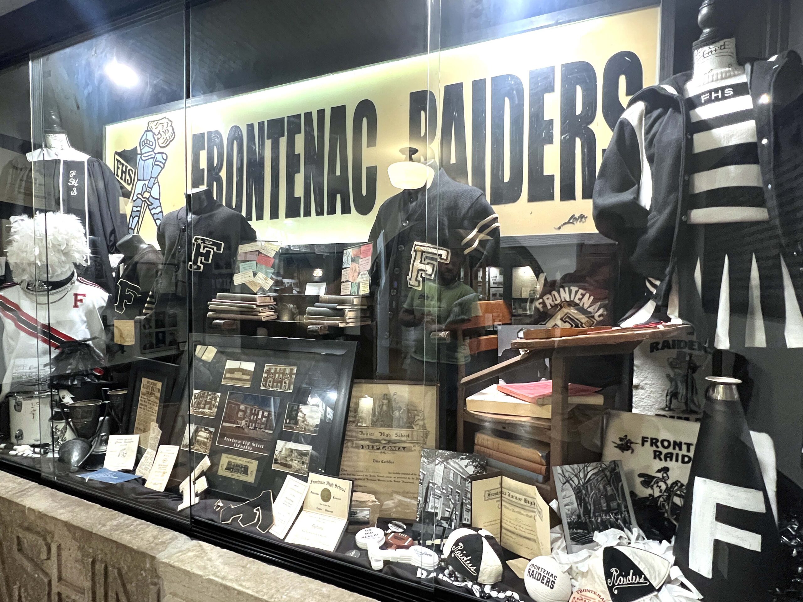 Former and current Frontenac residents will relish the displays featuring curated Raiders memorabilia. Peering inside the displays, it was as if I could hear the football players and cheerleaders rooting for the Raiders to win the high school’s first-ever state football championship over Stockton in 1994.