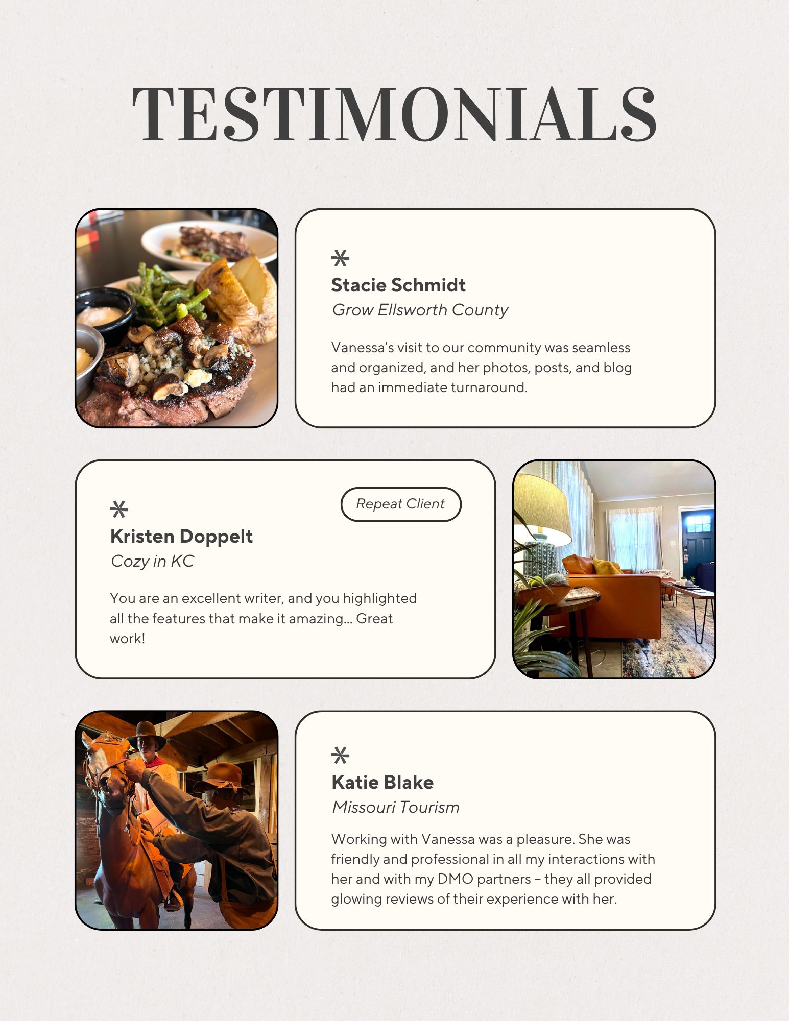 Voted Midwest Travel Network’s Blogger of the Year 2022, I’ve partnered with dozens of tourism organizations to develop content highlighting destinations. Each hosted trip generated a blog post, social media influence, and contributed photography. How does it work?